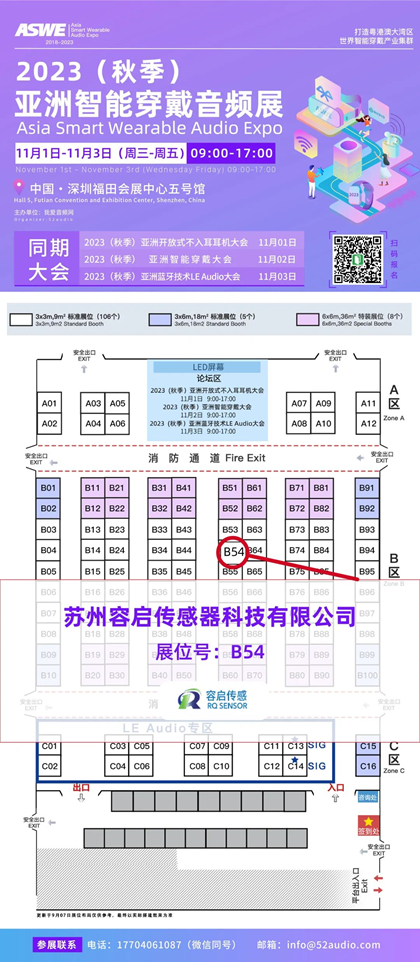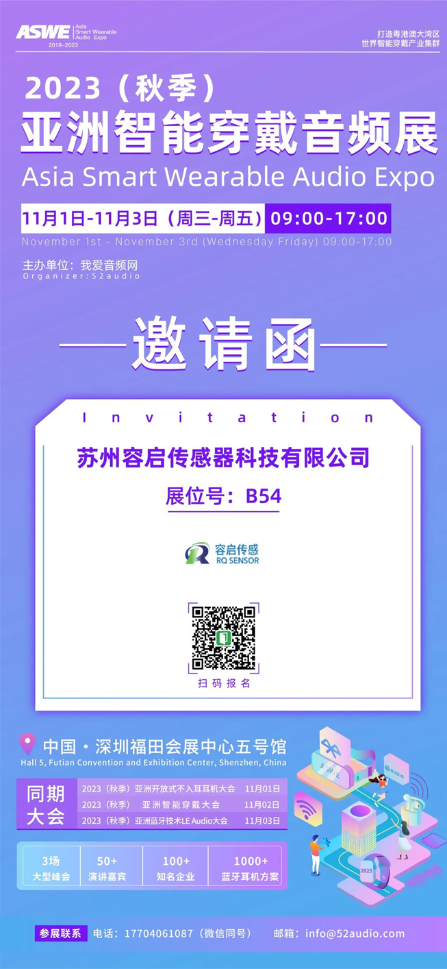 容启传感一直秉持自主创新、专业专注、质量第一、用户至上的核心发展理念,致力于为客户提供专业的、高性价比的解决方案,努力成为国际一流的智能传感器服务供应商。2023(秋季)亚洲智能穿戴音频展容启传感也将会展示最新产品,并分享他们对未来发展的见解。欢迎大家前来B54交流!