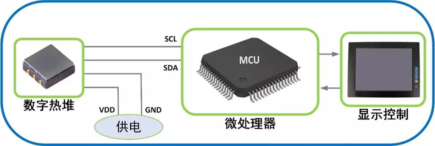 RQS9063D系列非接触式数字热电堆温度传感器,包括一个红外传感器(热电堆)和一个内建的传感器信号调理芯片,可以通过I2C接口连接到任何微控制器,这个微控制器可以方便获取ADC值和校准参数来计算温度结果。